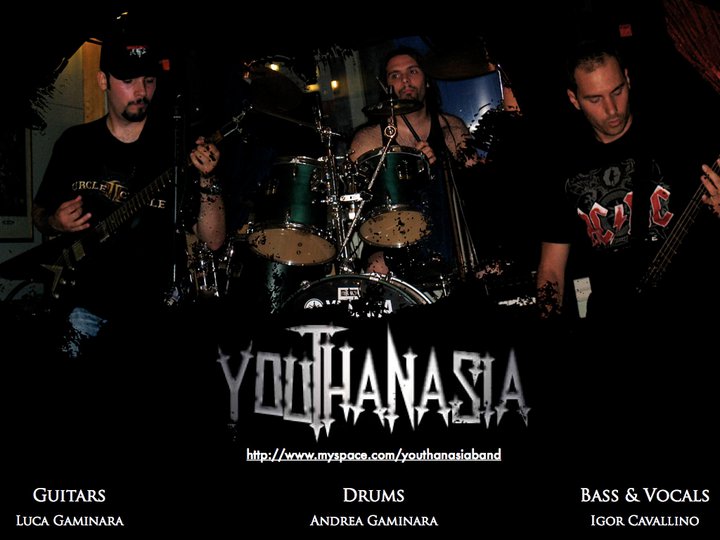 Gli YOUTHANASIA nascono a Savona nel 2001 come gruppo di cover hard rock; la prima formazione vede sui palchi savonesi un trio composto da Igor (basso e voce), Stefano (chitarra) e Sergio (batteria); purtroppo dopo un primo periodo di attività quest’ultimo è costretto, per impegni lavorativi, a lasciare la band. Subentra così in formazione il nuovo batterista, il giovane Andrea. L’attività live sui palchi dei locali si intensifica notevolmente e contemporaneamente il già vasto repertorio di cover si arricchisce sempre più ed inizia ad acquistare ulteriore valore con l’introduzione di musica inedita. Nel 2003, la voglia di avere un supporto con il quale poter promuovere la propria musica porta il trio savonese ai Nadir Studio di Genova di Tommy Talamanca (Sadist) dove incide la prima demo che si intitola “Pain of one”; il mini cd, registrato completamente in presa diretta, è composto da sei brani inediti di heavy/thrash con richiami e sfumature hard-rock piuttosto marcate. L’attività promozionale della demo è affidata interamente agli spettacoli live che continuano ad essere il fulcro su cui verte l’attività principale della band che nell’estate del 2005, a Lucca, ha l’occasione di aprire un concerto ai ben più famosi Exilia. Nel 2006 l’attività del trio subisce un piccolo rallentamento, tuttavia la band non interrompe il progetto e riesce abbastanza velocemente a superare il momento di difficoltà. Entra in formazione un altro chitarrista, Luca, gemello di Andrea. La band si trasforma così in un quartetto e, per circa 2 anni, la formazione trova il suo equilibrio tanto che nel 2007 torna nuovamente ai Nadir Studio per incidere un nuovo demo composto anche stavolta da pezzi inediti. La registrazione questa volta è molto più curata e professionale, i pezzi contenuti nel potente “I believe in nothing” sono profondamente diversi dai brani di “Pain of one”; lo stile della band ha subito una sterzata verso sonorità marcatamente più heavy e ha perso in larga parte le influenze hard-rock iniziali.